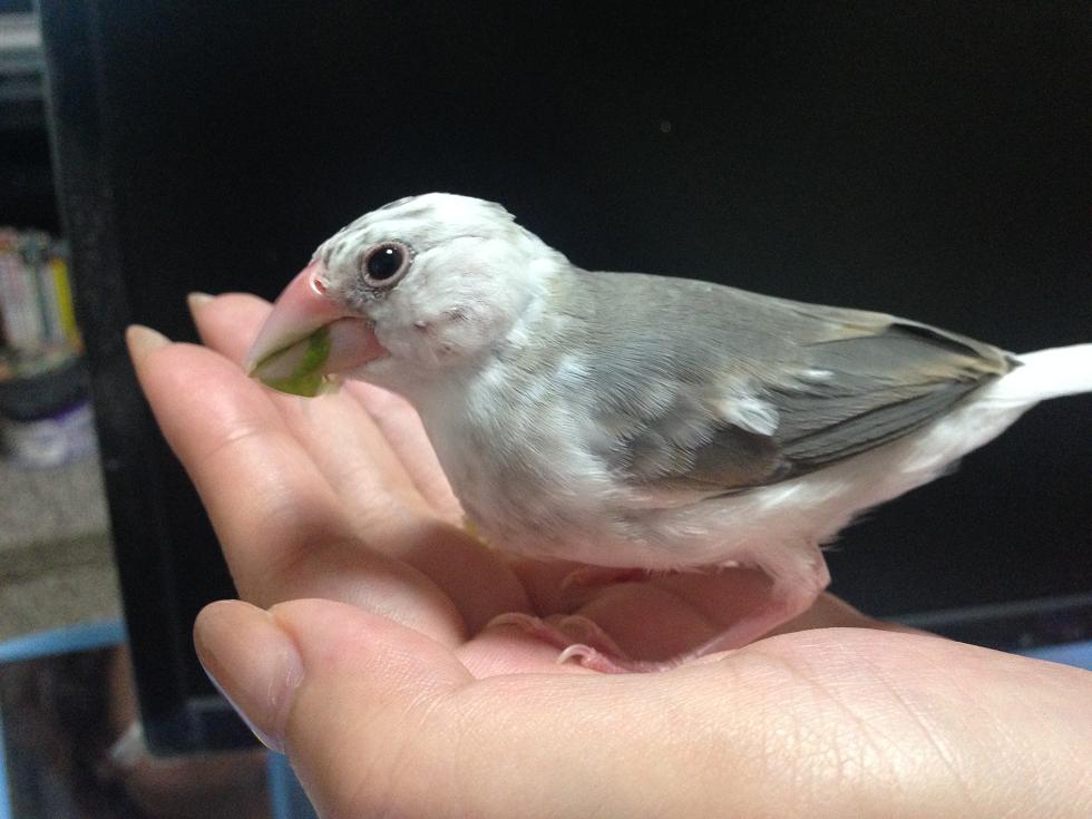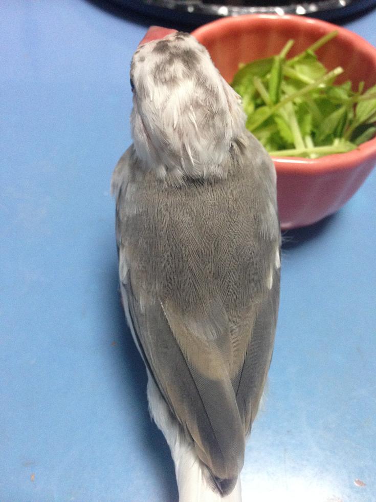 洗面台の鏡に激突しただと? 文鳥さんの暮らしぶり 2015年12月13日 【飼育43日目/生後推定63日】体重28g <ヒナ換羽13日目> 後頭部の筆毛が少しづつ開いてきました。 乾いていると分かりにくいですが、全体的には薄くなってきており、抜けかけている羽がピンピン立っているような感じです。 よーく見ると、クチバシの周りも薄くなっていました。 いつものショット。豆苗にご満悦のよう 後頭部に白い部分が増えてきた! お口にちょっと付いてるよってレベルじゃないぞ! 今日は、飼い主の後追いをして洗面所に飛び込んで来たのですが、勢い余って鏡に激突してしまいました。 思えば手鏡も見せたことが無かったので、普通に景色だと思って飛び込んでしまったよう。 狭いスペースなのであまりスピードが出ていなかったのは幸いでしたが、コチンッとぶつかって「クピィ!」と聞いたことがないような叫び声をあげていました。 その後、何事も無かったように元気に飛んでいたので、ひとまずは良かった・・・。 今後は洗面台のカーテンは閉めておくようにしたいと思います・・・。 さて、今日も結局ケージに取り付けたバードバスからは勝手に水浴びしませんでした。 バードバス自体は初めてではないのですが、そのうち放っておいたらするようになるかな? 今日も手から水浴び。いい水だったと言わんばかりのこの表情 そして今日は粟穂を与えるようになってから4本目のものに交換しました。 やはりカッスカスのものより、実がプリプリいっぱい付いている新しいものに代えると喜んで毟ってくれます。 そろそろ次の粟穂を購入しなければ! [4回]PR